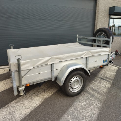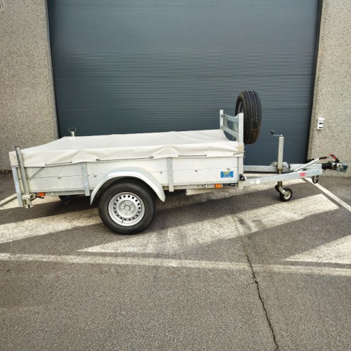 Equipée d’une bâche plate, 2 béquilles arrières, une roue de secours sur support